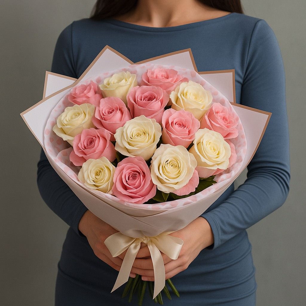 Элегантный букет из розовых и белых роз — это символ нежности и гармонии. Изысканное сочетание оттенков и стильное оформление делают композицию идеальным подарком для дня рождения, юбилея, романтической встречи или просто приятного сюрприза. Такой букет подчеркнёт ваши чувства и создаст атмосферу радости и уюта.