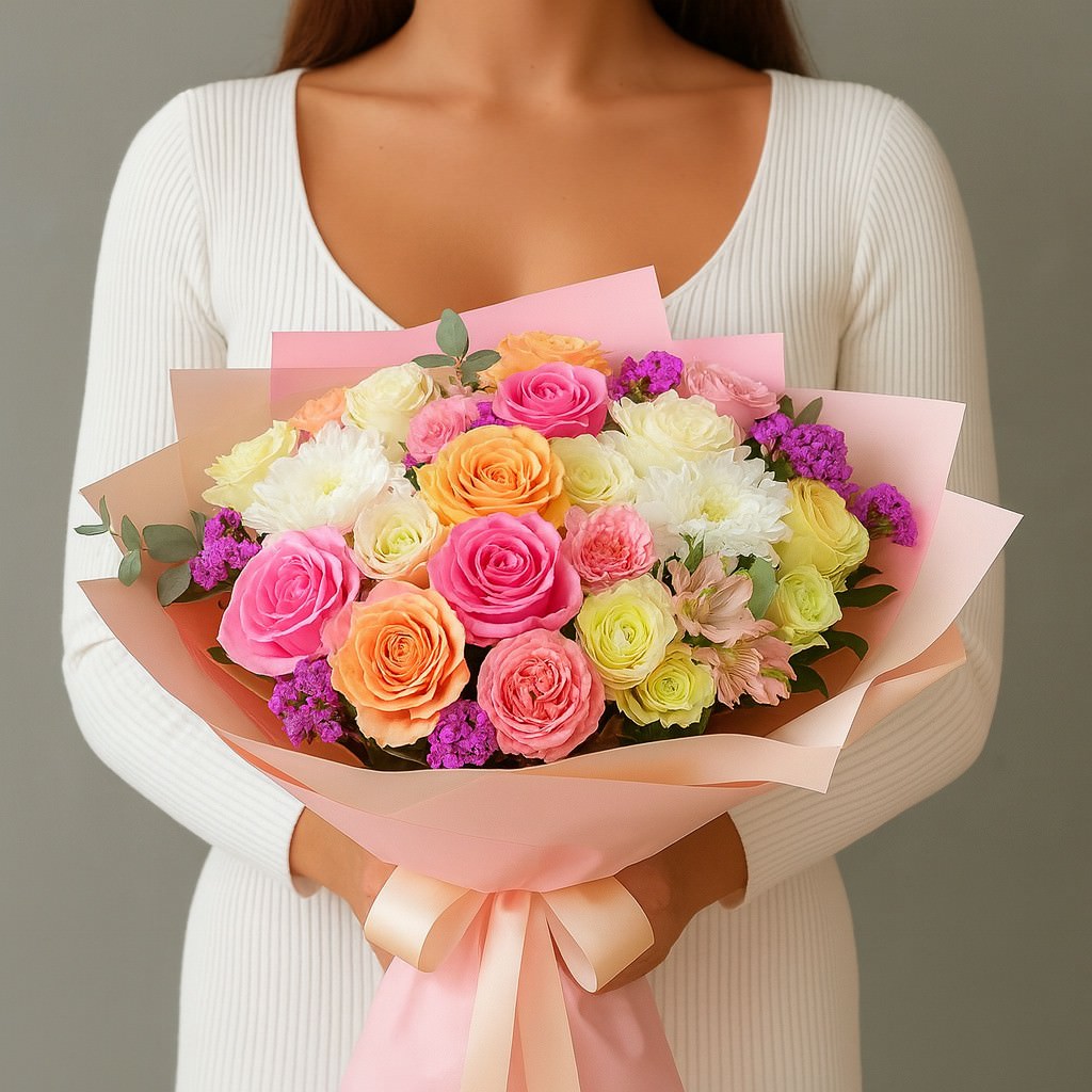 Насыщенный и солнечный букет, в котором гармонично переплетаются розы разных оттенков, изящные альстромерии и нежные хризантемы. Яркие вкрапления статицы добавляют композиции выразительности и поднимают настроение. Такой букет станет прекрасным подарком для особого повода или для того, чтобы порадовать близкого человека без причины.