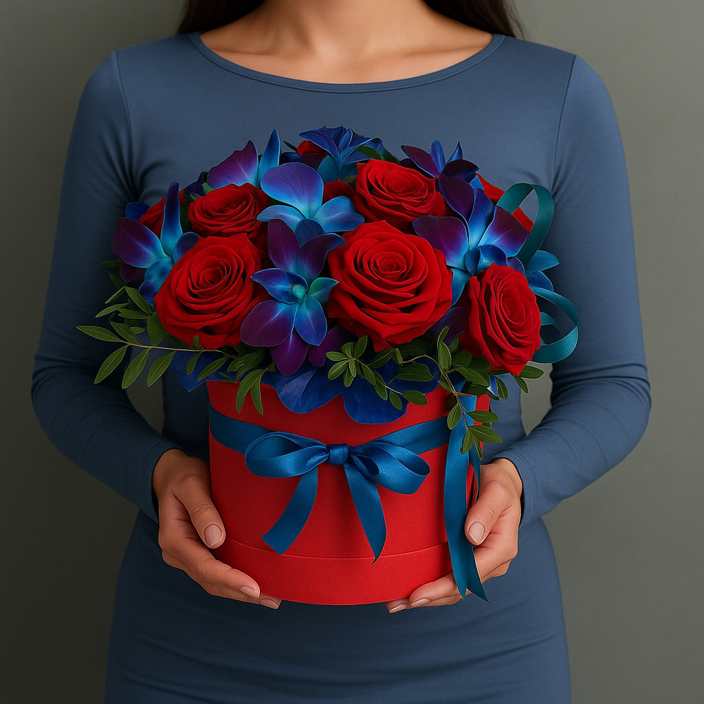 Эффектная композиция с красными розами и синими орхидеями в стильной красной коробке. Символ страсти и роскоши.