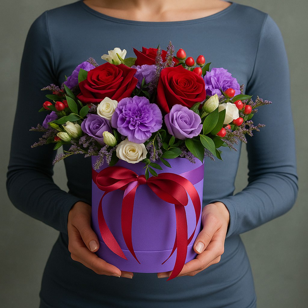 Яркая композиция с красными розами и сиреневыми гвоздиками. Эффектный подарок, который точно запомнится.